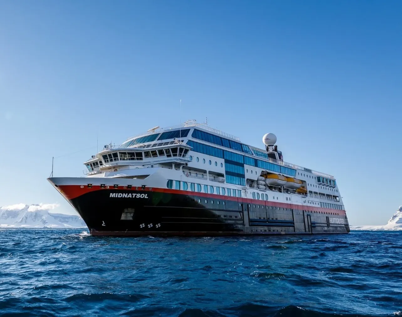 One of our best-known ships, MS Midnatsol (previously MS Maud) is named after the Midnight Sun, the phenomenon that occurs in northern Norway every summer when the sun doesn’t set for 24 hours.