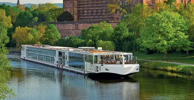 River-view stateroom with floor-to-ceiling sliding glass door opening to a full-size veranda
