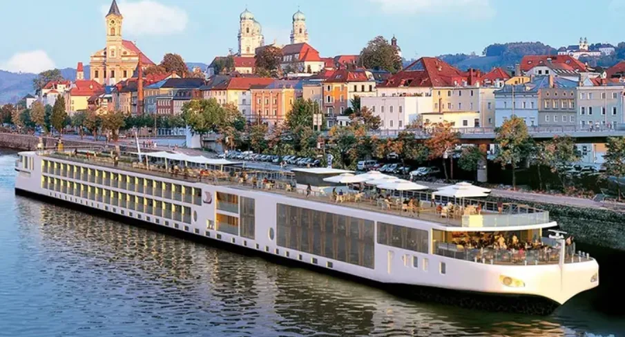 River-view stateroom with floor-to-ceiling sliding glass door opening to a full-size veranda