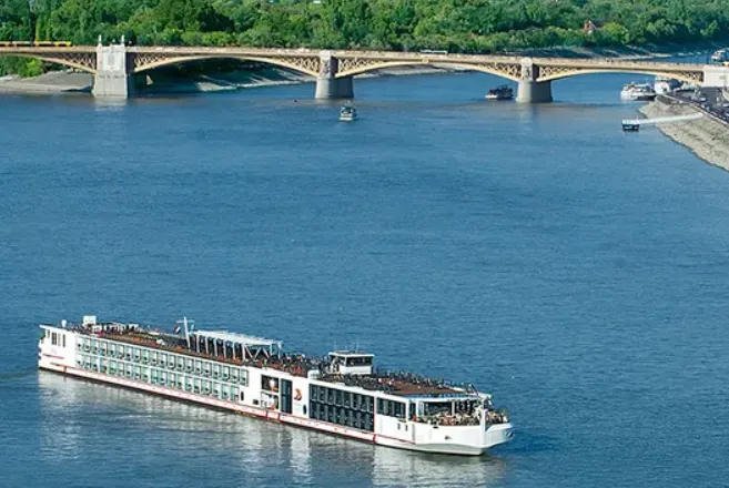 River-view stateroom with floor-to-ceiling sliding glass door opening to a full-size veranda