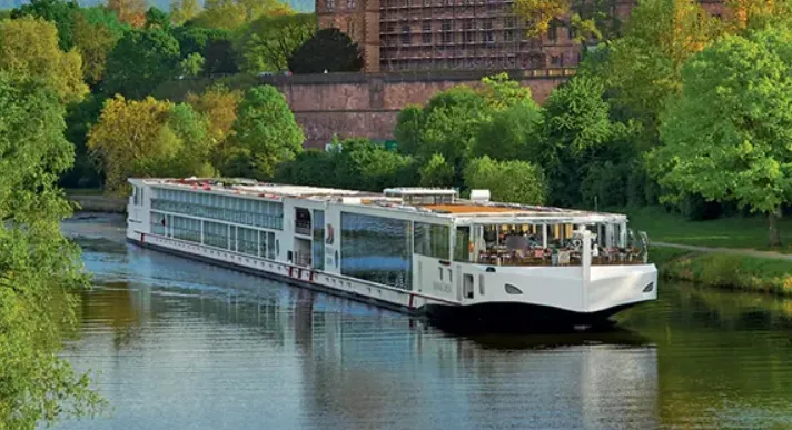 River-view stateroom with floor-to-ceiling sliding glass door opening to a full-size veranda