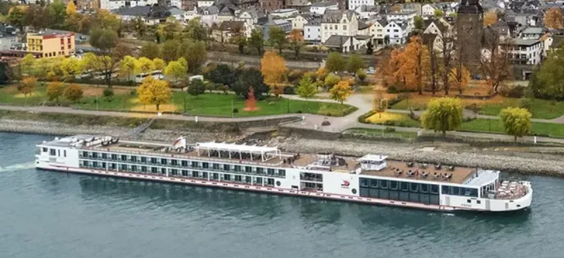 River-view stateroom with floor-to-ceiling sliding glass door opening to a full-size veranda